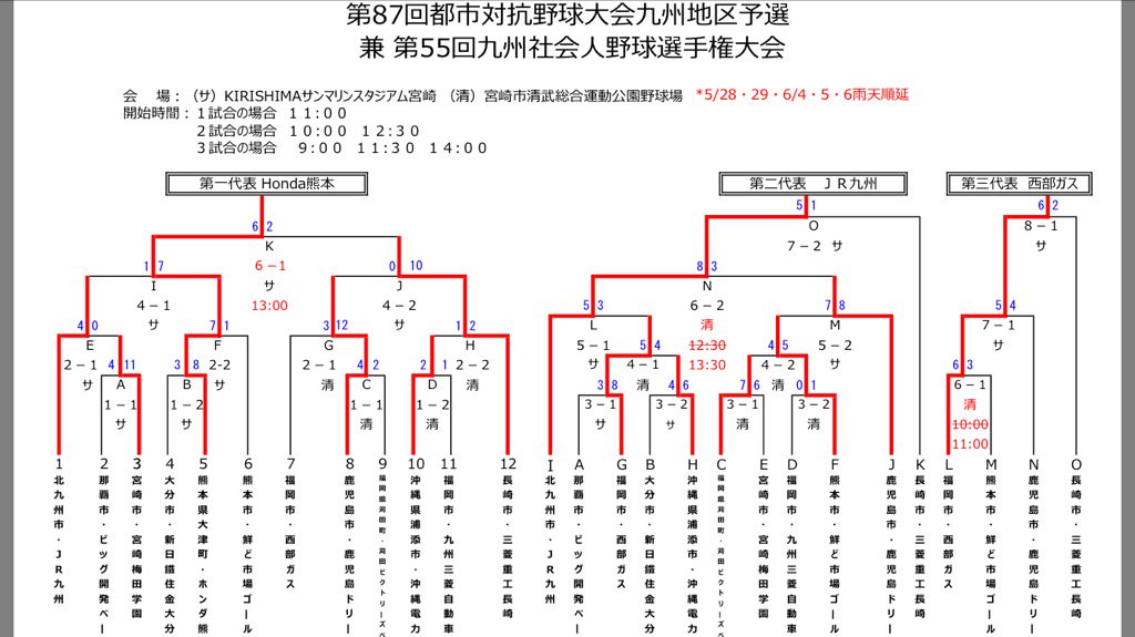 第87回都市対抗野球大会 組み合せが決定しました 16年5月25日 第87回都市対抗野球大会九州地区予選 兼 第55回九州社会人野球選手権大会の組み合せが決定しました 16年4月13日試合日 時間 対戦相手 勝敗 スコア 球場;・高松宮賜杯 第60回全日本大会軟式野球大会(2部)九州ブロック予選 07/30 鹿児島 ・第6回 九州都市対抗軟式野球大会 11/ 北九州市 ・第23回 九州成年選抜軟式野球大会(40才以上) 05/29 長崎県 ・日本スポーツマスターズ16九州ブロック大会(40才以上) 07/02 07/1617